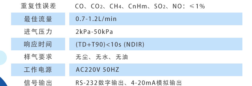 CO、CO2、CH4、CnHm、SO2、NO:≤±1%FS |