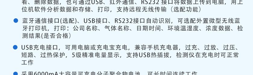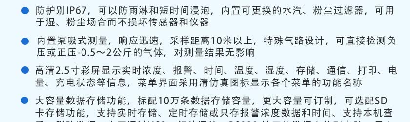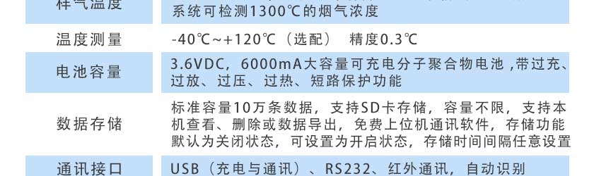 1.2m可伸縮采樣手柄(標準長度1米)、溫濕度測量功能、外置微型無線藍牙打印機、高溫采樣降溫過濾手柄、高溫高濕預處理系統、濕度粉塵過濾器多個、SD卡存儲、無線數據通訊 |