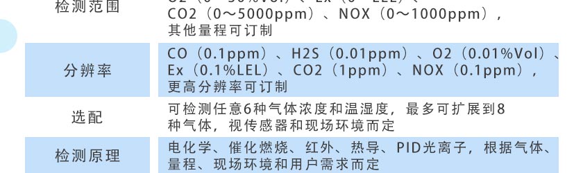 CO(0.1ppm)、H2S(0.01ppm)、O2(0.01%Vol)、Ex(0.1%LEL)、CO2(1ppm)、NOX(0.1ppm),更高分辨率可訂制 |