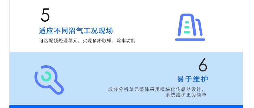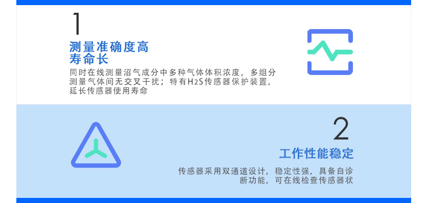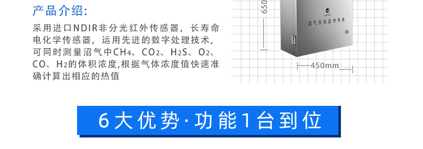 采用進口NDIR非分光紅外傳感器,長壽命電化學傳感器,運用先進的數(shù)字處理技術(shù),可同時測量沼氣中CH4、CO2、H2S、O2、CO、H2的體積濃度,根據(jù)氣體濃度值快速準確計算出相應的熱值。