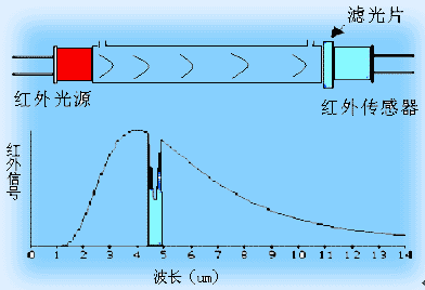 由于各種物質(zhì)分子內(nèi)部結(jié)構(gòu)的不同,就決定了它們對不同波長光線的選擇吸收,即物質(zhì)只能吸收一定波長的光。物質(zhì)對一定波長光的吸收關(guān)系服從朗伯—比爾(Lambert2Beer)吸收定律。下圖為NDIR紅外氣體分析原理圖:以CO2分析為例,紅外光源發(fā)射出1~20μm的紅外光,通過一定長度的氣室吸后,經(jīng)過一個4.26μm波長的窄帶濾光片后,由紅外傳感器監(jiān)測透過4.26μm波長紅外光的強(qiáng)度,以此表示CO2氣體的濃度。