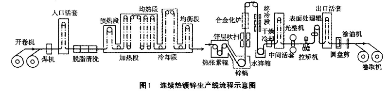 開(kāi)卷→焊接→脫脂清洗→退火爐→(預(yù)熱→加熱→均熱→冷卻→均衡)→熱浸鍍鋅→(合金化爐)→鍍后冷卻→光整→拉矯→表面處理(鈍化/耐指紋)→切邊→在線質(zhì)量檢測(cè)→涂油→卷取。其流程示意圖如圖1所示。