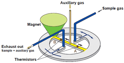 這是利用氧順磁性的方法之一。當(dāng)樣品氣體含有氧氣時,氧氣被吸入磁場,從而降低氣流B中輔助氣體的流速。由氣流B中流動限制的影響引起的兩個氣流A和B的流速差與樣品氣體的氧氣濃度成比例。流速由熱敏電阻決定,并轉(zhuǎn)換成電信號,其差值作為氧信號計算。