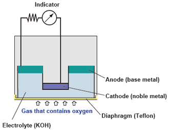 如果氧氣通過隔膜溶解在陽極(賤金屬)和陰極(貴金屬)彼此相鄰的電解液中,則產(chǎn)生與溶解氧量成比例的電流。通過隔膜的氧氣量與樣品氣體的氧氣分壓成比例,因此,氧氣濃度可以通過測量電流來確定。
