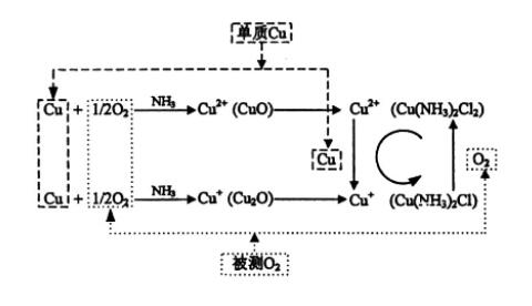 所生成的氧化銅和氧化亞銅分別與氨水、氯化銨作用,生成可溶性的高價(+2價)銅鹽Cu(NH3)2Cl2和低價(+1價)銅鹽Cu2(NH3)2Cl2。低價銅鹽吸收氧氣轉成高價銅鹽,高價銅鹽又被銅還原成低價銅鹽,如此循環作用,直到混合氣體中的氧氣耗完為止。根據氣體體積的減少量即可得到氣體中的氧含量(體積百分比濃度)。在整個測量過程中,只要溶液中有足夠的純銅存在,就能保證化學反應的持續進行。