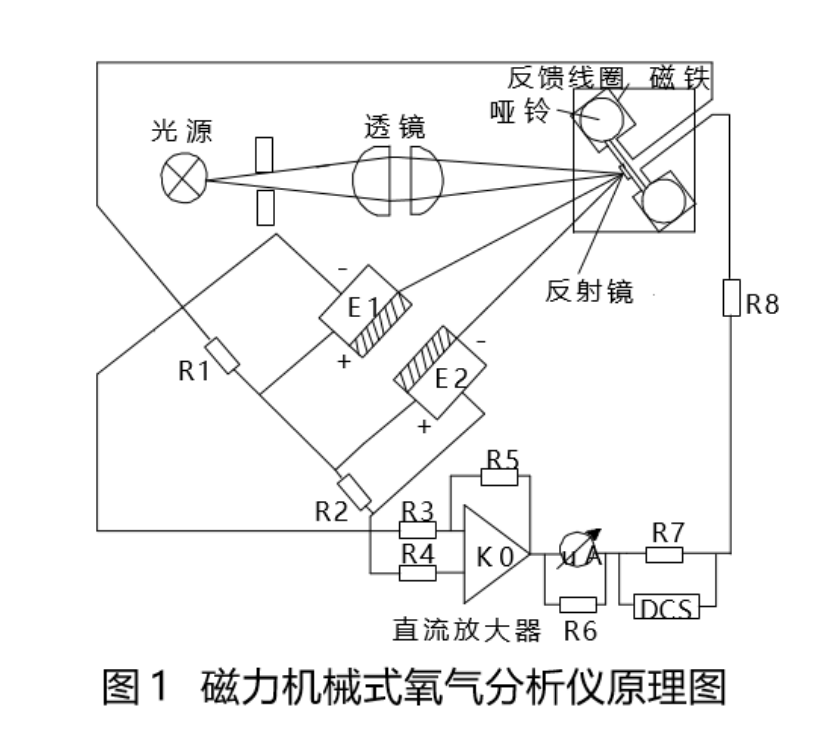 1.1磁機械式氧分析原理:由于氧氣分子具有較強的順磁性,氧氣分子會向著磁場增強的方向移動。通過兩種不同的氧含量氣體在磁場作用下所形成的的壓力差,并根據機械原理采用一根極為靈敏的鋼絲來懸吊啞鈴球,兩種不同的氧含量氣體在磁場中的壓力差會使偏移,而啞鈴球偏轉角度與混合氣體中含氧量濃度成正比,并由特定的光源、反射鏡以及感光原件所組成單元準確地測定出啞鈴球的偏轉角度,進而確定混合氣體中氧含量的百分比。