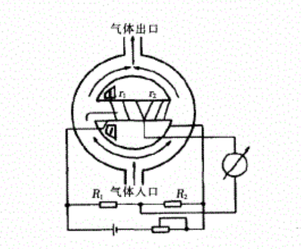 在一個中間有通道的環形氣室內,外面均勻繞著電阻絲,電阻絲通入電流后既起到加熱的作用,同時又是測量溫度變化的感溫元件。電阻絲從中間一分為二,作為兩個相鄰的橋臂電阻r1、r2,與固定電阻R1、R2組成測量電橋。在中間通道的左側設置一對小電極,以形成恒定的不均勻的磁場。待測氣體從底部人口進人環形氣室后,由于受到磁場的吸引而進入水平通道,當它處于磁場強度最大的區域時,也同時被電阻絲加熱。在加熱區被測氣體溫度升高,電阻絲溫度降低。被加熱的氣體由于溫度升高,體積磁化率將急劇下降,受磁場的吸引力也就大為減弱。而其后冷態的順磁性氣體在磁場的作用下繼續被吸引到磁場強度最大的區域,這就對先前已受熱的順磁性氣體產生向右方向的推力,使其流動而脫離磁場區域。如此周而復始,形成"磁風"。當被測氣體的磁化強度(即氧含量)越大,形成的"磁風"越強,帶走電阻絲的熱量就越多,電阻絲的阻值就變化越大,阻值的變化與被測氣體中的氧含量呈正比關系,因此可對被測氣體中的氧含量進行測量。