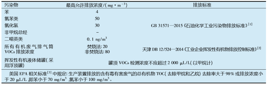 目前國內外有機化工裝置的苯和氯苯類污染物排放標準見表1。我國各項污染物排放標準均嚴于美國EPA的排放標準。