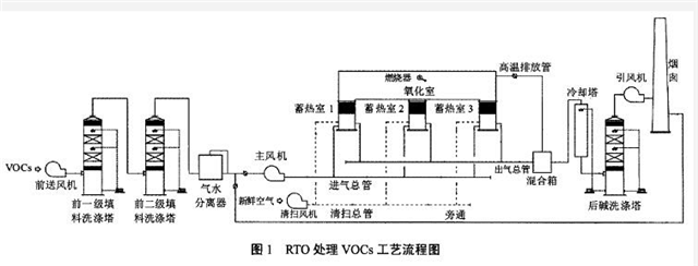 蓄熱氧化反應器有3個爐體,三室RTO的操作原理是在一個蓄熱室進氣、一個蓄熱室排氣的同時,一個蓄熱室處于吹掃狀態。在一個循環后,廢氣始終進入到在上一循環時排出凈化氣的蓄熱室,而原來進入廢氣的蓄熱室則用凈化氣或空氣沖洗。每個爐體有進氣、出氣、和空氣清洗三個階段,三臺爐體進氣、出氣、和空氣清洗三個階段的切換構成了三條廢氣通道。進氣時,廢氣吸收進氣爐體蓄熱體中的熱量升溫全氧化反應溫度,進入燃燒室充分燃燒后進入出氣爐體,將熱量傳遞給蓄熱床體后排出,處于清洗狀態的爐體用空氣將進氣時爐體中殘留廢氣置換并送入燃燒室。蓄熱室在進去以后用于排氣之前均可得到吹掃,從而解決了VOC直接排放問題,提高了VOC的平均破壞去除率。