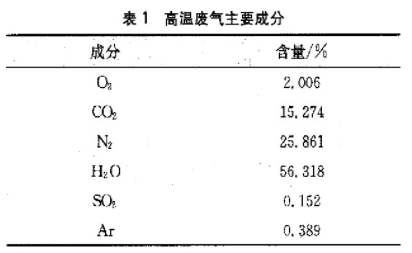 以萬州凈化廠為例:設(shè)計天然氣處理能力為200萬Nm/d,原料天然氣H2S含量30~60g/Nm,COz含量50~100g/m。脫硫裝置通過甲基二乙醇胺(MDEA)溶液對原料天然氣中的酸性組分進(jìn)行脫除,并利用溶液再生時產(chǎn)生的酸氣通過硫磺回收裝置將酸氣組分中的HS轉(zhuǎn)化生成硫磺,設(shè)計硫磺回收率達(dá)99.25%。未完全轉(zhuǎn)化的HS通過尾氣灼燒爐燃燒為SO2并排人大氣。雖然有較高的回收率,但因酸氣量大,未完全回收的HS燃燒產(chǎn)生的SO量也非常大。萬州凈化廠尾氣灼燒爐灼燒后的高溫廢氣主要成分見表1.