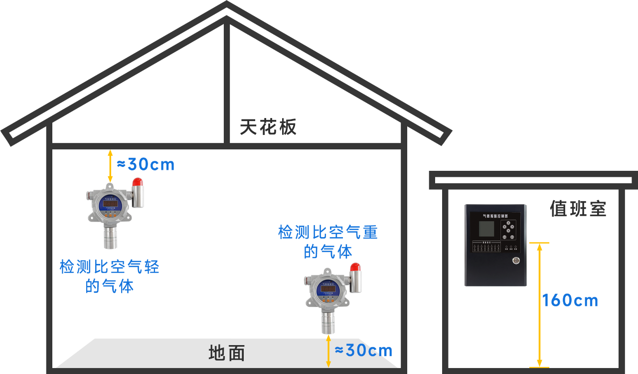 2.檢測可燃氣體比重小于空氣時,可燃氣體檢測儀安裝位置應(yīng)該在疑似泄漏點上方,距離天花板不大于30-60cm,檢測可燃氣體比重大于空氣時,可燃氣體檢測儀安裝位置應(yīng)該在疑似泄漏點下方30-60cm,距離地面不大于30cm;