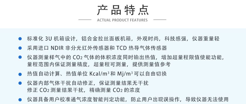3)儀器測量樣氣中的CO2氣體的體積濃度同時輸出熱值。增加超量程限值使能功能,量程范圍內保證測量精度,超量程可測量,提供測量值參考。