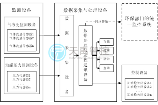 加油站油氣回收在線監測系統由現場端傳感層、傳輸層、中心端應用三部分組成,現場端部分為安裝傳感器,信號處理、數據傳輸主要內容。