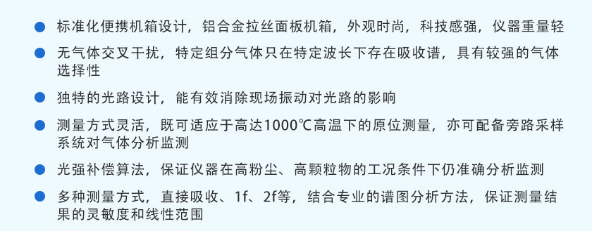 用國際先進的TDLAS激光技術,主要用于測量各種氣體中的HF、HCL、O2、CO、CO2、H2O、O2、NH3、CH4?等氣體體積濃度及熱值。