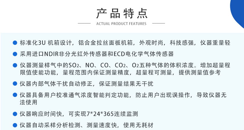 SO2、NO、CO、CO2:≤±1%FS;O2:≤±2%FS