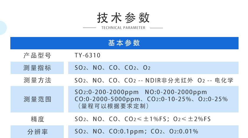 SO2、NO、CO:0.1ppm;CO2、O2:0.01%