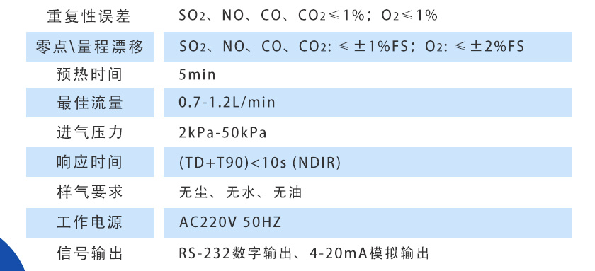 SO2、NO、CO、CO2≤±1%FS;O2≤±2%FS