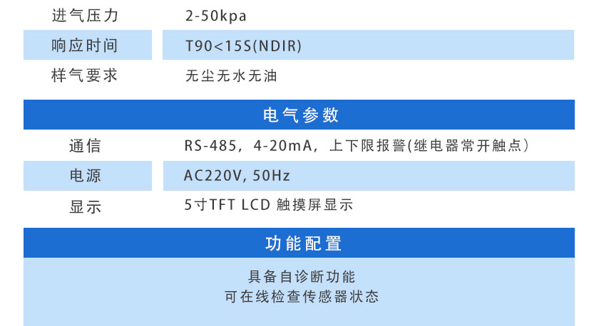 CO:0-2000ppm,CO2:0-50% ,CH4:0-100%,H2:0-1000ppm,O2:0-25%,H2S:0-9999ppm (量程可根據(jù)用戶實(shí)際需求配置) |