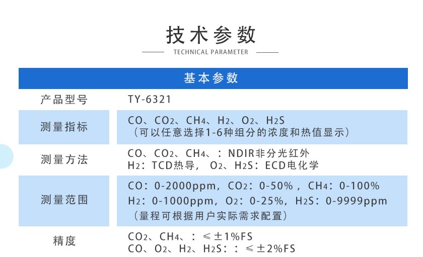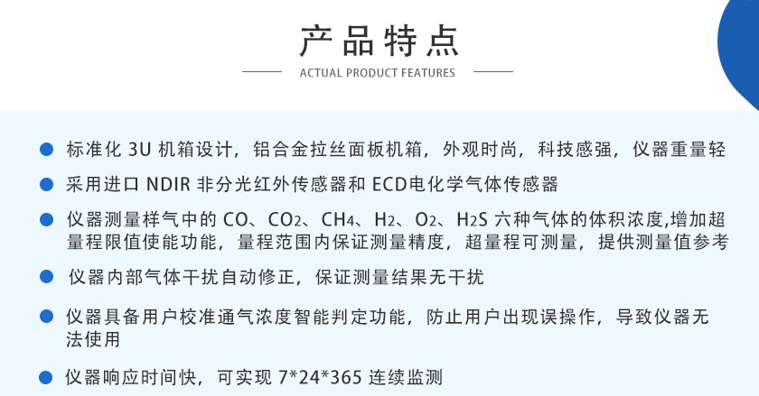 CO、CO2、CH4、:NDIR非分光紅外 H2:TCD熱導, O2、H2S:ECD電化學 |