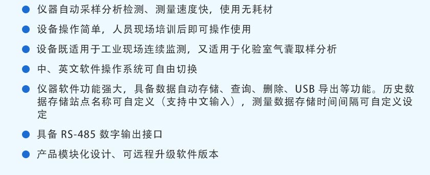 該分析儀基于紫外差分吸收光譜技術(DOAS)和化學計量學算法(PLS),能夠測量SO2、NO、NO2、O2、NH3、CO、CO2、Cl2、O3、H2S、HCl、CH3I等氣體濃度,具有測量精度高、可靠性強、運行成本低、響應時間快、量程跨度大、應用范圍廣等特點。