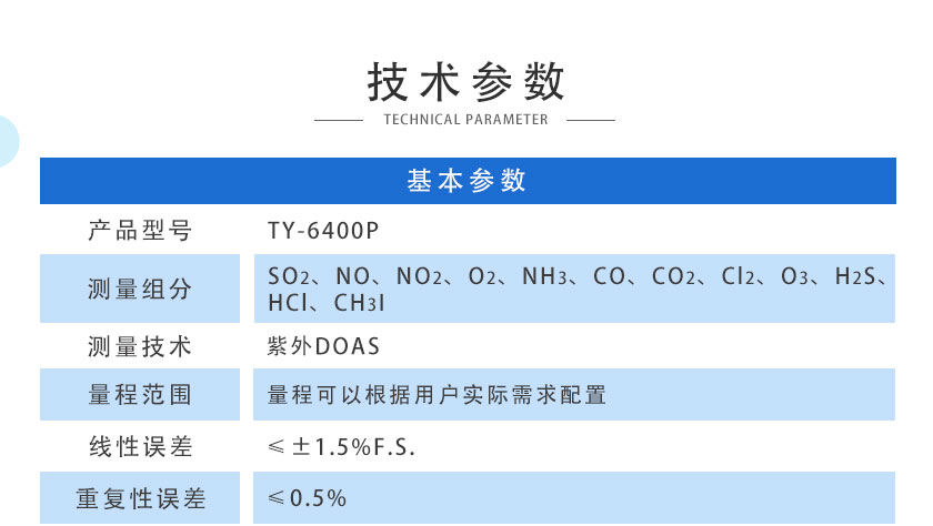 • 在線紫外氣體分析儀 TY-6400 針對國內外環保在線監測、工業在線分析自主研發的氣體分析產品。該分析儀基于紫外差分吸收光譜技術(DOAS)和化學計量學算法(PLS),能夠測量SO2、NO、NO2、O2、NH3、CO、CO2、Cl2、O3、H2S、HCl、CH3I等氣體濃度,具有測量精度高、可靠性強、運行成本低、響應時間快、量程跨度大、應用范圍廣等特點。